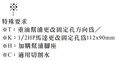 7、如需改用切削水,亦可客制化訂作,請(qǐng)?jiān)谟嗁彺a處加注※C。