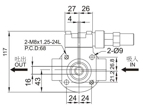 4、重油泵浦標(biāo)準(zhǔn)品固定孔方向?yàn)閈,若欲更改固定孔方向?yàn)?,請(qǐng)?jiān)谟嗁彺a處加注※T。