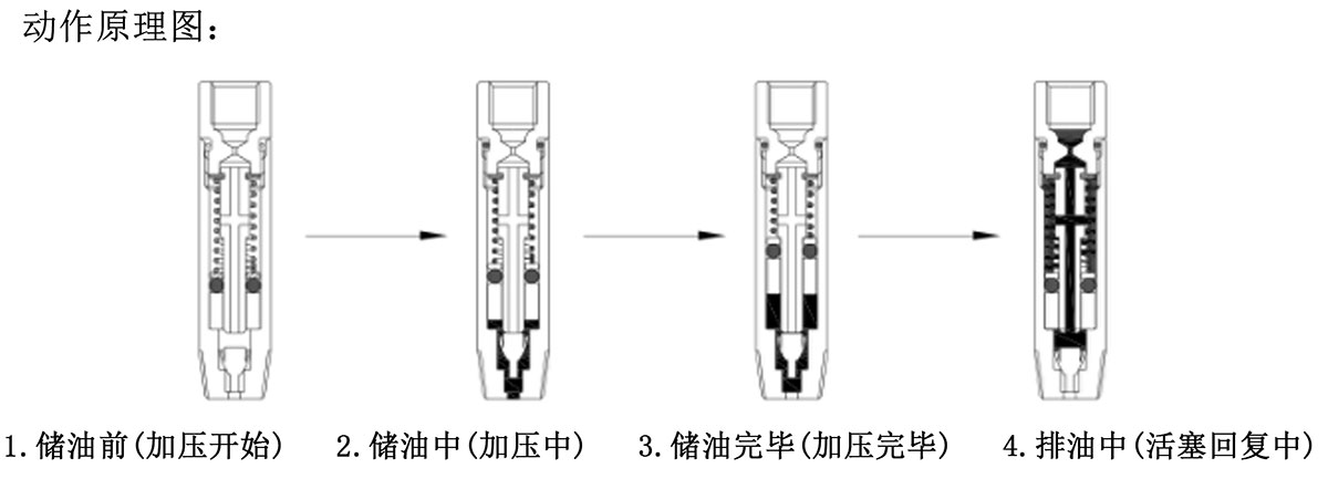 2、傘形閥把芯桿中心孔封閉后,迫使活塞克服簧力開始上升,將上腔原存儲的潤滑油排出;