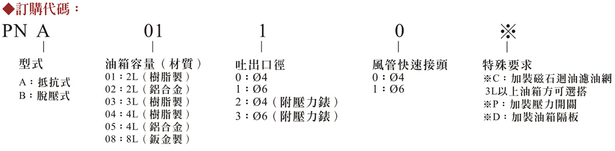 PNA、PNB型氣動式注油機(jī)流量較小,適用于需要較小流量之機(jī)械設(shè)備,一般常用于編織機(jī)、鈑金機(jī)械等