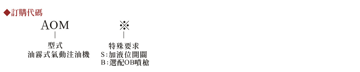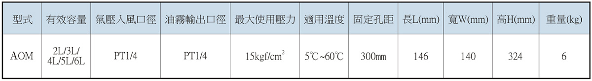 6.AOM型油霧式氣動(dòng)注油機(jī)之氣壓源,可搭配空壓機(jī)直接驅(qū)動(dòng),或使用電磁閥作氣壓源的開關(guān)·以控制氣壓源 ON/OFFI的切換動(dòng)作 7.AOM型建議使用之氣壓源4-8kg,可發(fā)揮較佳之霧化效果