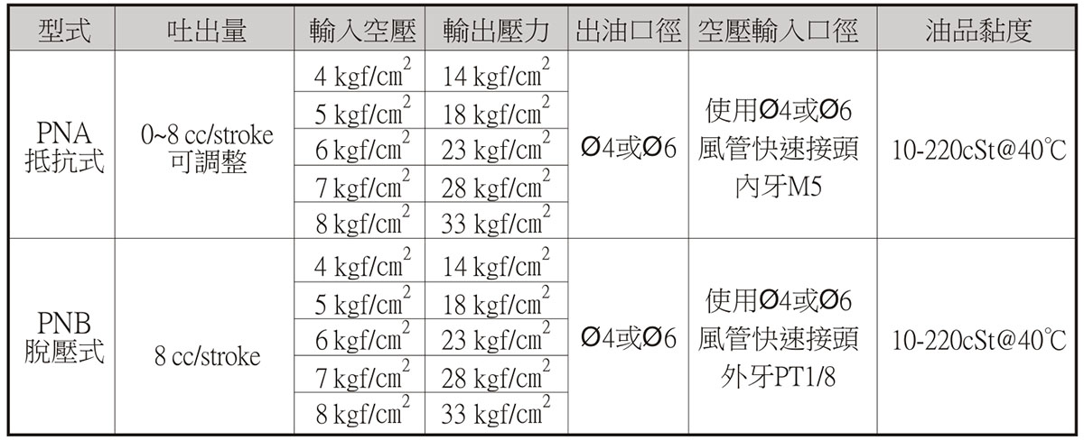 PNA、PNB型氣動(dòng)式注油機(jī)流量較小,適用于需要較小流量之機(jī)械設(shè)備,一般常用于編織機(jī)、鈑金機(jī)械等