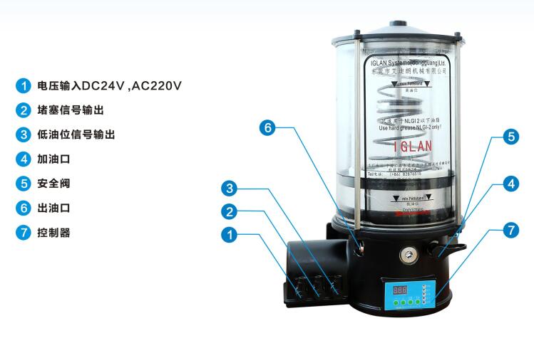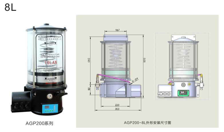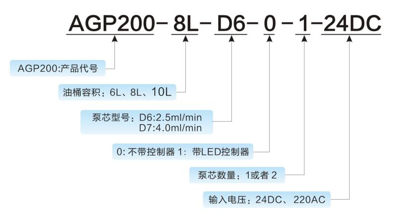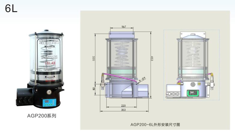 AGP200電動潤滑泵利用直流電機驅(qū)動力,進行柱塞泵進行往復吸油和排油。電源采用DC24V電源,油桶提供6L、8L、10LPc透明塑料,可分壓盤式和攪拌式兩種,壓盤式上通過錐度彈簧進行加壓,可倒置與旋轉(zhuǎn)中工作。AGP200電動潤滑泵內(nèi)置壓力開關(guān)、計數(shù)、低油位傳感器報警信號輸出。有安裝2個排量為2.5cc/min柱塞泵。外部安裝安全閥,壓力可達30MPa。