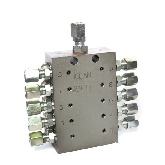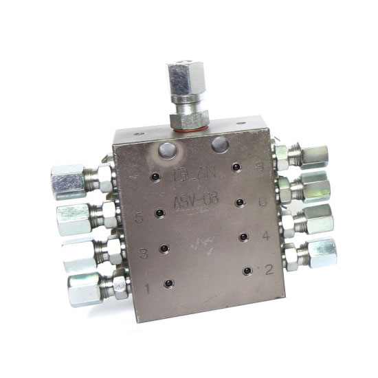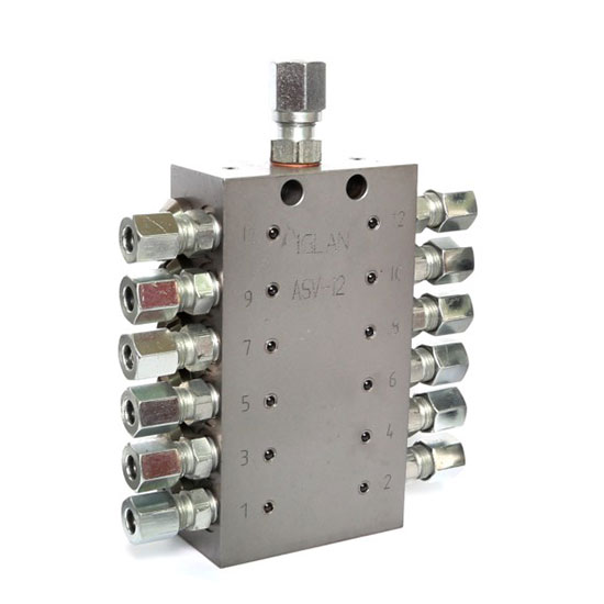 ASV型整體式分配器有6、8、10、12、14、16、18、20、22出油口,標準單出口流量為0.2 ml/cyc,可拆除堵頭賀鋼珠及更換出油堵塞,提供0.4ml/cyc、0.6ml/cyc等為0.2 micca整倍數(shù)的排量。柱塞套通過油孔相連,以便建立壓力,只要有壓力的潤滑油進入進油口,分配器就會以遞進式的方式連續(xù)工作。一旦其中一個通道潤滑油停止流動,分配器中整個柱塞也將停止工作。因此,通過安裝特定的可目測機械式傳感器,觀察整個分配器的運動狀況,一旦發(fā)生堵塞,可有報警信號輸出,以便對整個潤滑系統(tǒng)進行監(jiān)控。