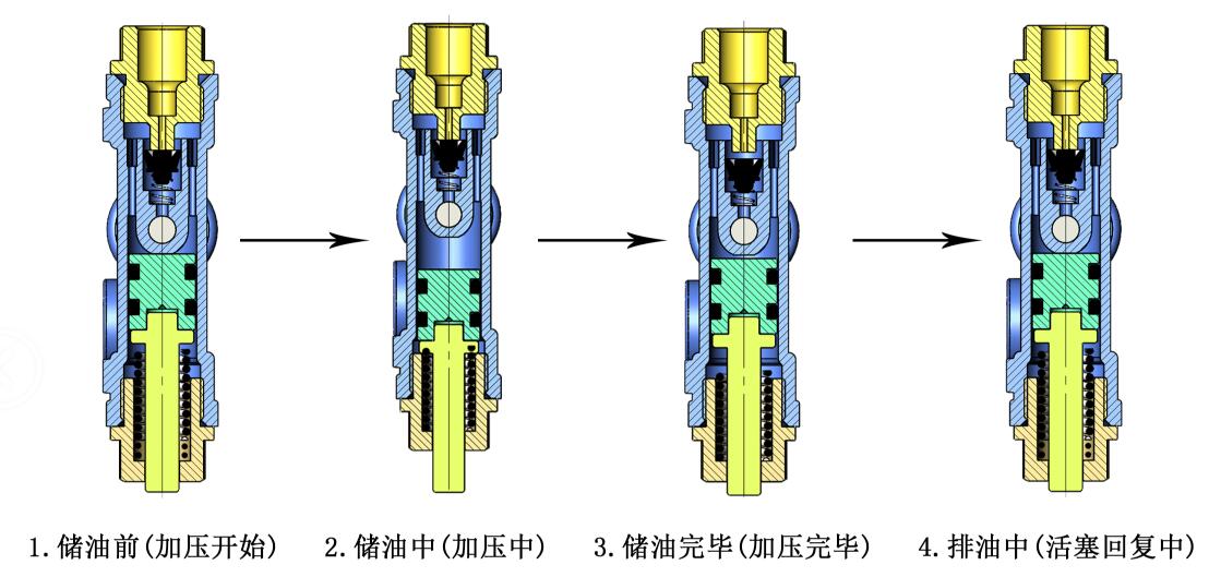 3、當活塞被頂至下腔頂點時,儲油完畢;